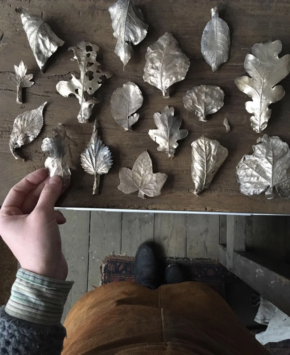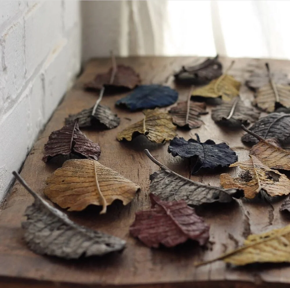 The Creative Countryside collection consists of 16 pieces. These sixteen leaves are entirely unique castings of real organic leaves collected by sixteen different people in rural Shropshire on the 18th of November 2018 during a seasonal gathering called the Creative Countryside Autumn Retreat where Hanna was hosting a leaf art workshop. There are many different species of leaves in this collection - amongst them are oak, hawthorn, cherry, elm, hornbeam, ivy, poplar, maple, smoke bush and nettle.