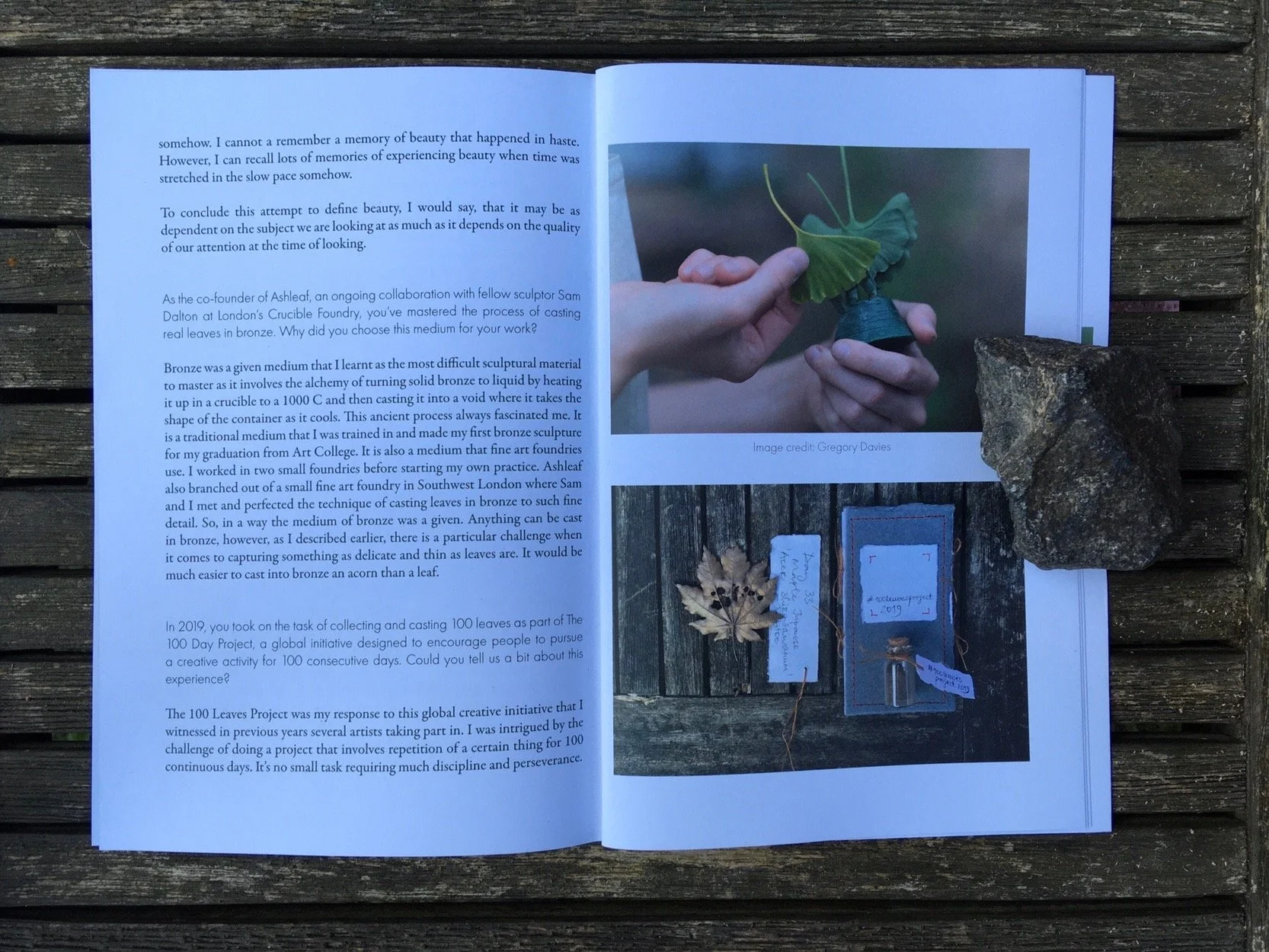 The real leaves were cast in bronze by Ashleaf, the small London-based art practice Hanna co-founded and was actively and collaboratively working in at the time these sculptures came into being. The bronze casting for Ashleaf was done at the Crucible Foundry in London using the traditional lost wax bronze casting technique.