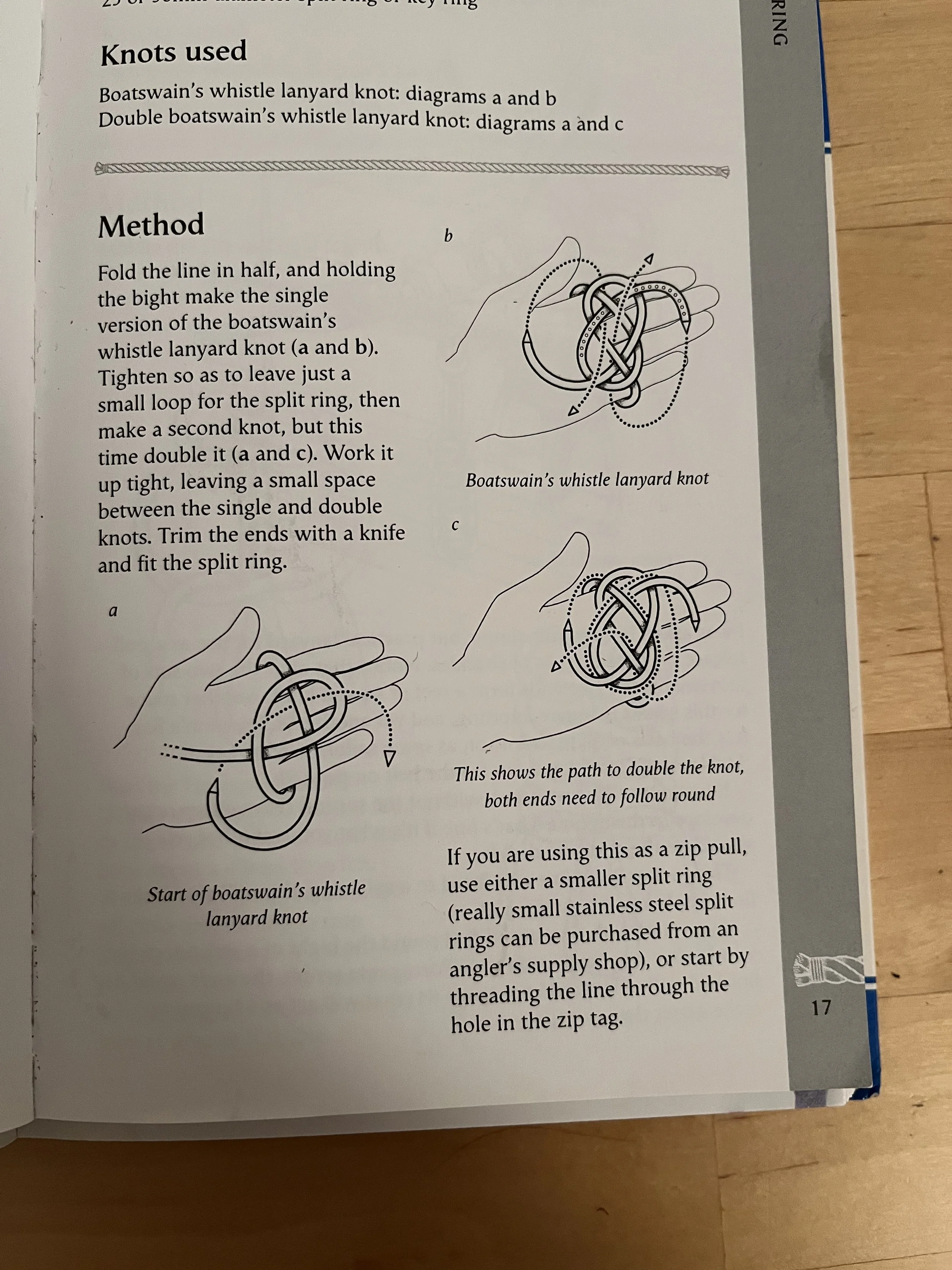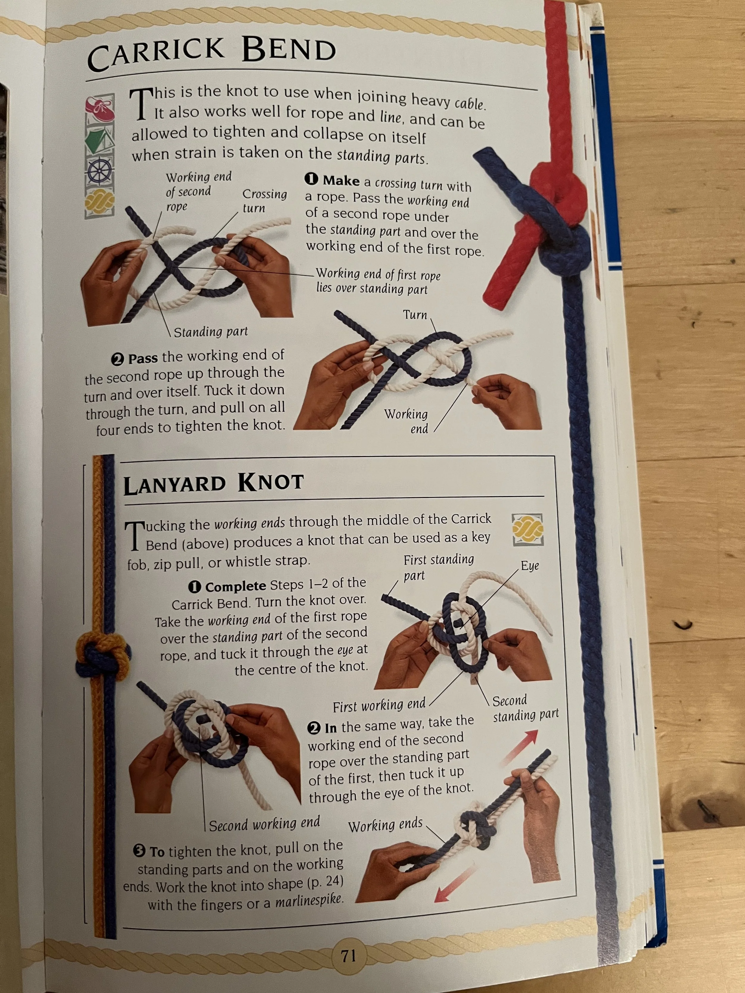 In the last 15 minutes of our meeting I proposed to try and teach you a knot to tie as an introduction to the wonderful art of knot tying, which is the basis of the Boatswain’s Whistle Lanyard Knot and is also known as the Carrick Bend. As promised at the end before we said our goodbyes, please find below photos I’ve taken from two different knotting books, both written by master ropemaker Des Pawson. May these helps you learning this knot.